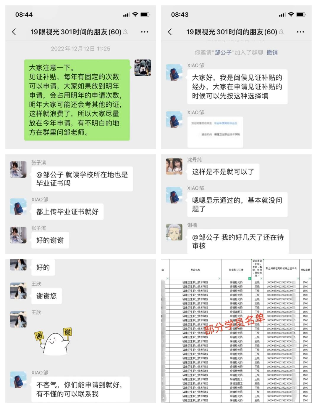 據(jù)悉,以往應屆畢業(yè)生“見證補貼”資金申領需前往戶籍所在地人社局申請。且各地補貼資金申領政策差異較大、申請程序繁瑣等原因大大降低了學生的申請意愿。繼續(xù)教育學院在了解情況后,迅速組建黨員志愿服務隊,聯(lián)合醫(yī)學技術(shù)系成立眼視光專業(yè)學生“見證補貼”工作專班,創(chuàng)建微信服務工作群,并邀請閩侯縣人社局審核專員入群指導。針對學生提出的各項問題給予了悉心指導,解決學生在證書補貼申領流程上的諸多疑問,大大提升了申領效率,打通證書補貼資金申領“最后一公里”。截至目前,我校共有126名學生成功申領補貼,三級證書(高級)每人可領取補貼1500元,合計補助金額189000元。