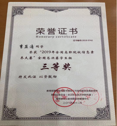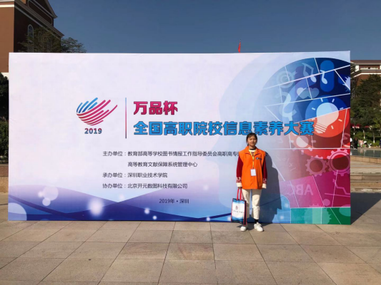 為迎接中華人民共和國成立70周年,弘揚“不忘初心、牢記使命”、愛崗敬業(yè)、無私奉獻精神,12月4日,由管理系第二黨支部支委張眉芳老師及圖書館張麗萍老師指導,第二支部入黨積極分子曾顯清同學獲得首屆全國高職院校信息素養(yǎng)大賽全國總決賽三等獎。