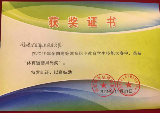 11月22日,全國高等體育職業(yè)教育學生技能大賽在美麗的海濱城市珠海落下帷幕,我校管理系體育保健與康復專業(yè)3名選手組成代表隊榮獲“體育道德風尚獎”。參賽選手18級體育保健與康復專業(yè)301班楊浩、鄭鳳龍、劉雪琴榮獲“健身指導技能”比賽團體三等獎。
