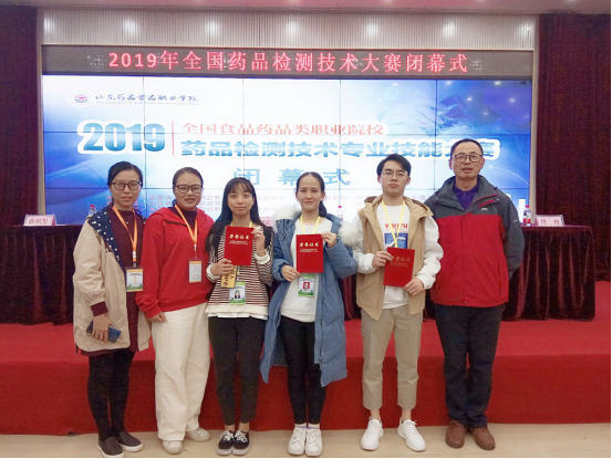 2019年全國食品藥品類職業(yè)院?!八幤窓z測技術(shù)”技能大賽于11月1至3日在山東藥品食品職業(yè)學(xué)院舉行。藥學(xué)系黃智偉、陳雪萍、吳婉婷三名同學(xué)組成的學(xué)生團隊榮獲團體二等獎的好成績。