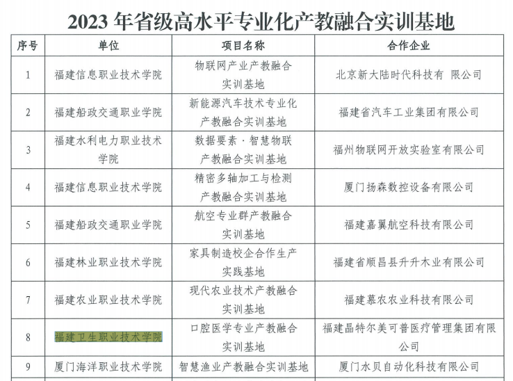 日前,福建省教育廳公布了2023年省級(jí)職業(yè)教育信息化和產(chǎn)教融合重點(diǎn)項(xiàng)目。我?!爸腔劢】诞a(chǎn)業(yè)學(xué)院”項(xiàng)目獲批省級(jí)第五批高職院校產(chǎn)業(yè)學(xué)院試點(diǎn)項(xiàng)目;“口腔醫(yī)學(xué)專業(yè)產(chǎn)教融合實(shí)訓(xùn)基地”項(xiàng)目獲批省級(jí)高水平專業(yè)化產(chǎn)教融合實(shí)訓(xùn)基地;《護(hù)理學(xué)基礎(chǔ)》《健康評(píng)估》《臨床藥物治療學(xué)》《健康管理實(shí)務(wù)》《藥學(xué)綜合知識(shí)與技能》《生理學(xué)》《康復(fù)評(píng)定技術(shù)》《電子技術(shù)應(yīng)用》8門課程獲評(píng)省級(jí)職業(yè)教育在線精品課程;“護(hù)理專業(yè)教學(xué)資源庫”“預(yù)防醫(yī)學(xué)專業(yè)教學(xué)資源庫”2個(gè)項(xiàng)目列為省級(jí)職業(yè)教育專業(yè)教學(xué)資源庫;《醫(yī)學(xué)信息技術(shù)基礎(chǔ)》《成人護(hù)理-外科護(hù)理》《病理學(xué)與病理生理學(xué)》《經(jīng)絡(luò)與腧穴》4門省級(jí)職業(yè)教育精品在線開放課程通過驗(yàn)收。