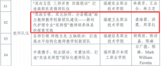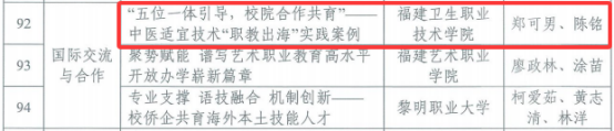 近日,福建省職業(yè)技術教育中心公布了2025年全省職業(yè)教育改革發(fā)展典型案例名單,我校報送的《思政引領、雙元協(xié)同、分層鍛造”助力教師教學創(chuàng)新團隊建設——新時代護理專業(yè)“雙師型”教師培養(yǎng)體系的探索實踐》(公共衛(wèi)生與健康管理學院)、《五位一體引導,校院合作共育”——中醫(yī)適宜技術“職教出?!睂嵺`案例》(醫(yī)學院)2個案例分別入選“教師隊伍”、“國際交流與合作”類型典型案例。