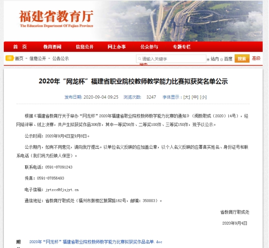 近日,2020年“網龍杯”福建省職業(yè)院校教師教學能力比賽線上決賽落下帷幕,我院教師榮獲3項專業(yè)課程組一等獎、1項專業(yè)課程組二等獎、1項公共基礎課程組二等獎、1項專業(yè)課程組三等獎、2項公共基礎課程組三等獎,共斬獲8項獎項。