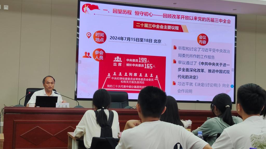 2024年9月19日,校長許能鋒在行政樓六樓會議室作題為“同心擘畫改革新藍(lán)圖 攜手奮進(jìn)強(qiáng)國新征程”開學(xué)第一課暨黨的二十屆三中全會精神宣講。