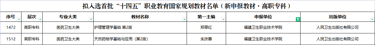日前,教育部職業(yè)教育與成人教育司公示了入選首批“十四五”職業(yè)教育國家規(guī)劃教材名單,我校鄭翠紅教授主編的《護理管理學基礎(第2版)》和朱扶蓉教授主編的《天然藥物學基礎與應用(第2版)》兩部教材入選。這是學校深入貫徹落實黨中央、國務院關于教材建設的決策部署和《國家職業(yè)教育改革實施方案》相關要求的重要成果,也是學?!半p高”建設取得的又一新成績。