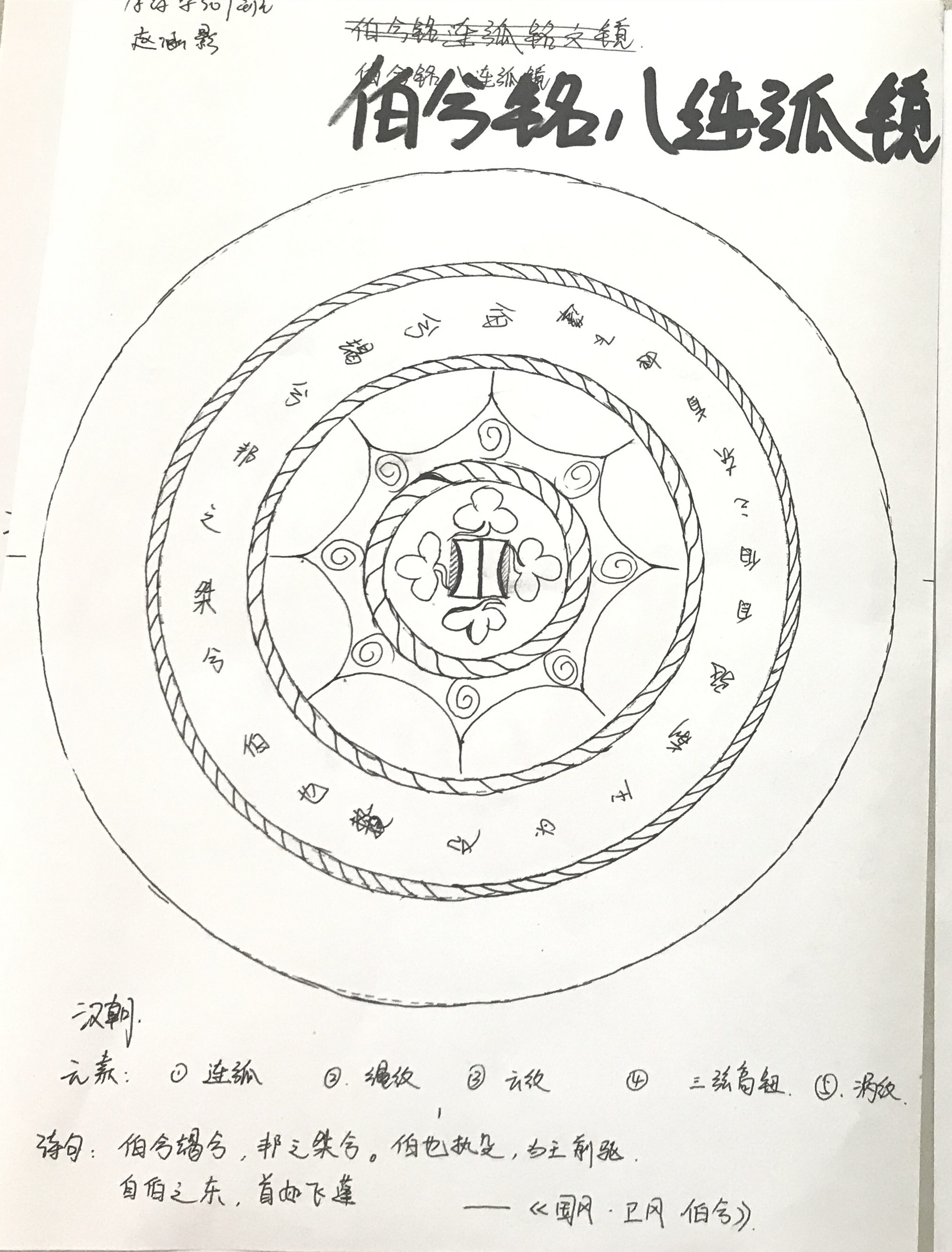 現場最優(yōu)秀的手繪作品出自18藥學307趙涵影同學,她的作品不僅完全符合漢代鏡背“相思銘文”和“紋飾繁復”的特色,還將使用到的每一種鏡背元素逐一列出注釋。本次活動使讀者們增進了對古銅鏡的了解,提高了對博物館中傳統(tǒng)文化的向往與好奇,有利于推進校園文化建設。