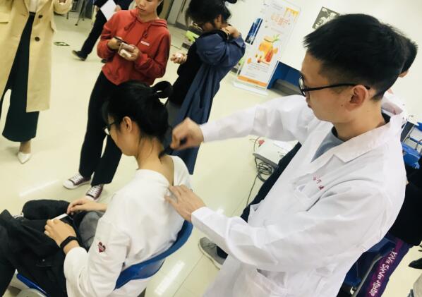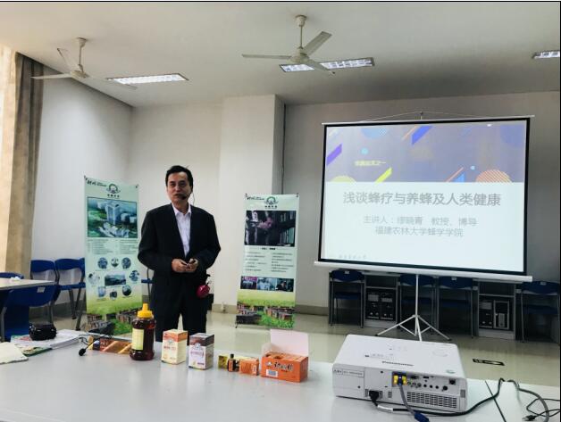 活動剛開始,蜂療研究所市場部經理陳凌鷹向大家介紹了蜜蜂的基本知識和蜂療研究所的發(fā)展歷程。接下來,蜂療研究所所長、福建農林大學蜂學院前院長繆曉青教授結合蜜蜂健康文化,親自為大家講述了自己和蜜蜂的結緣故事以及他研究發(fā)明神蜂精的歷程,非常具有啟發(fā)意義。最后,來自蜂療醫(yī)院的醫(yī)生介紹了蜂療手法和療效,并為參與活動的師生們現(xiàn)場實踐刮療手法,大家踴躍參與體驗,并紛紛表示這種蜂療手法效果顯著,體驗感受很舒適。