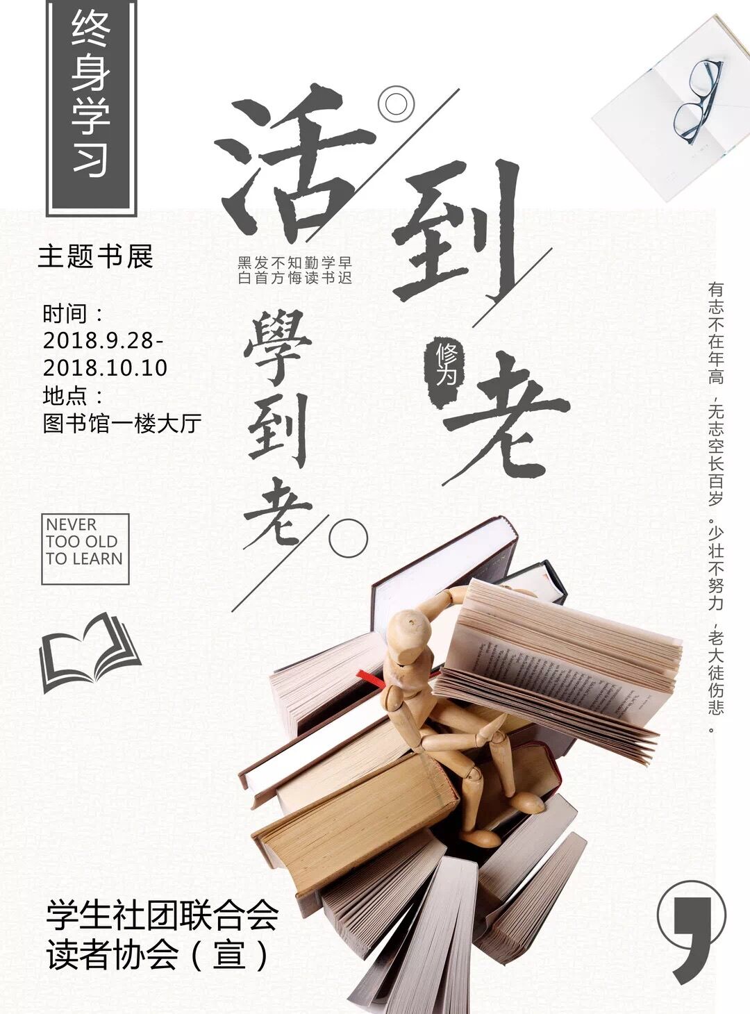 在“全民終身學(xué)習(xí)活動周”來臨之際,圖書館特舉辦“活到老、學(xué)到老”主題書展,精選各類好書百余冊在圖書館一樓大廳進(jìn)行展示,持續(xù)時間為2018年9月28日至10月10日,歡迎師生讀者前來借閱。