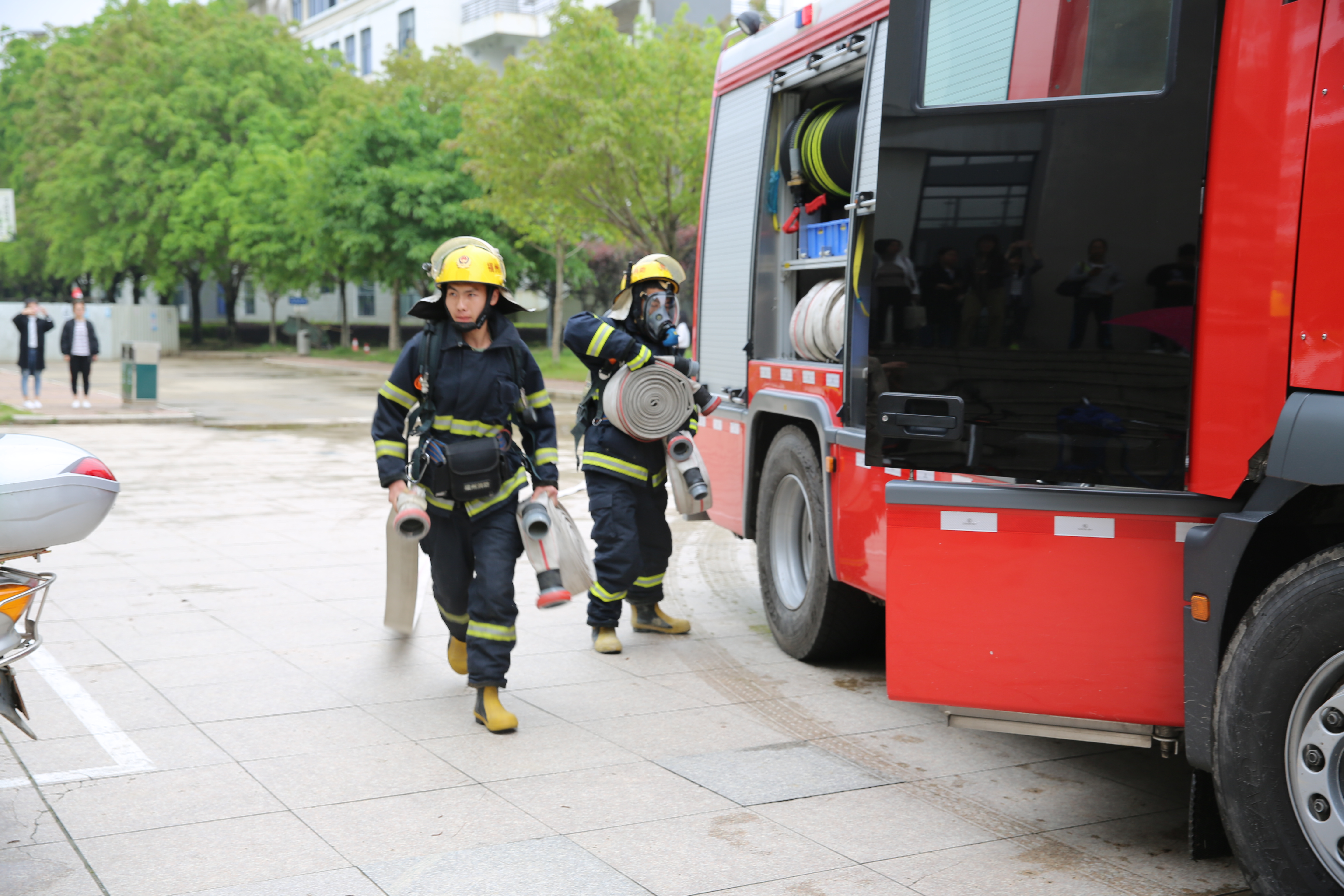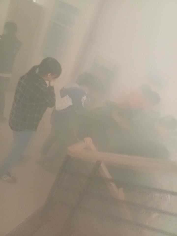 逃生演練開始,一陣急促的警報(bào)聲在圖書館內(nèi)響起,由教師組成的引導(dǎo)員隊(duì)伍迅速反應(yīng),引導(dǎo)室內(nèi)師生根據(jù)培訓(xùn)的逃生要領(lǐng)就地避險(xiǎn)。伴隨濃煙升起和一陣陣的警笛聲,引導(dǎo)員指揮師生按館內(nèi)的安全疏散路線,緊張、有序地向圖書館前的廣場撤離。兩分鐘后,館內(nèi)師生全部安全疏散到指定地點(diǎn)。閩侯消防大隊(duì)消防車也隨之到達(dá)現(xiàn)場,進(jìn)行現(xiàn)場人員搜救、消防演練。滾滾濃煙中,消防員迅速且有效的完成了各項(xiàng)演練。