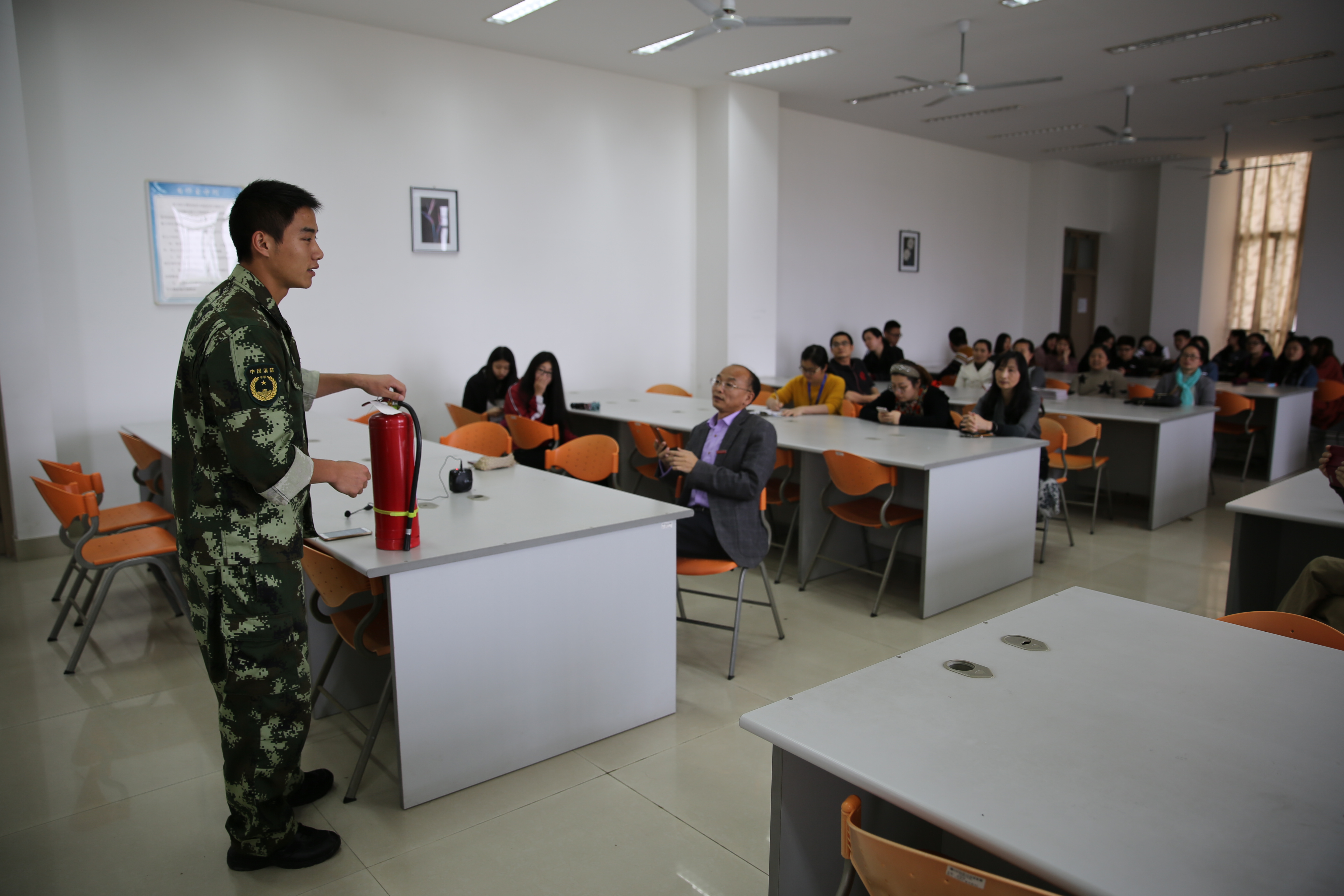 演練開始前,閩侯消防大隊(duì)?wèi)?zhàn)士對參加演練的師生進(jìn)行了安全知識培訓(xùn),就干粉滅火器使用、火場逃生要領(lǐng)和地震逃生要領(lǐng)進(jìn)行講解并現(xiàn)場演示。