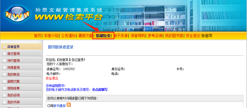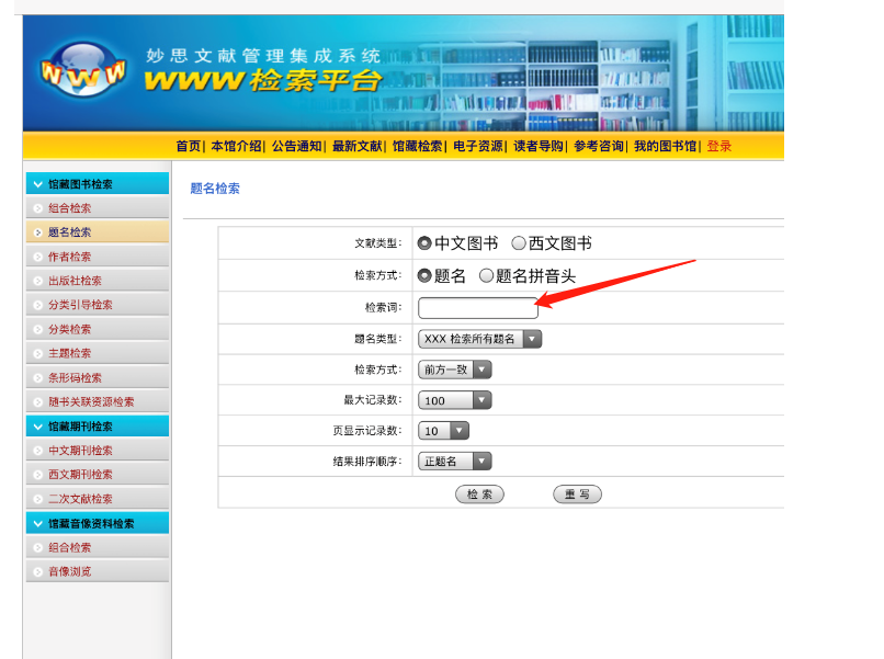 3、點擊“館藏書目檢索”,進入書目檢索界面。