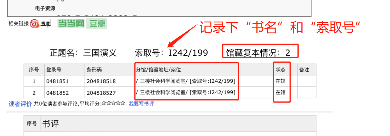 6、書目詳情頁,可查看圖書的館藏復(fù)本、館藏地址及圖書狀態(tài)等詳細(xì)信息,記錄下書名和索取號等關(guān)鍵信息,即可入庫找書;