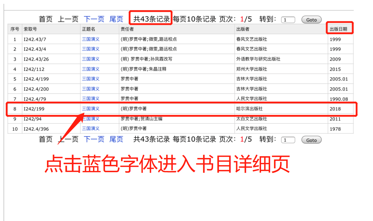5、進入檢索目錄頁,查看檢索結(jié)果,點擊所需書目的正題名,進入書目詳情頁;
