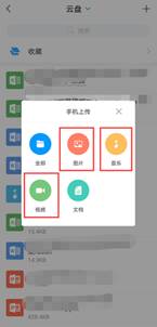 1學習通“我的”模塊點擊進入“云盤”,右上角“+”選擇手機上傳,可上傳圖片、音樂(錄音文件)、視頻等