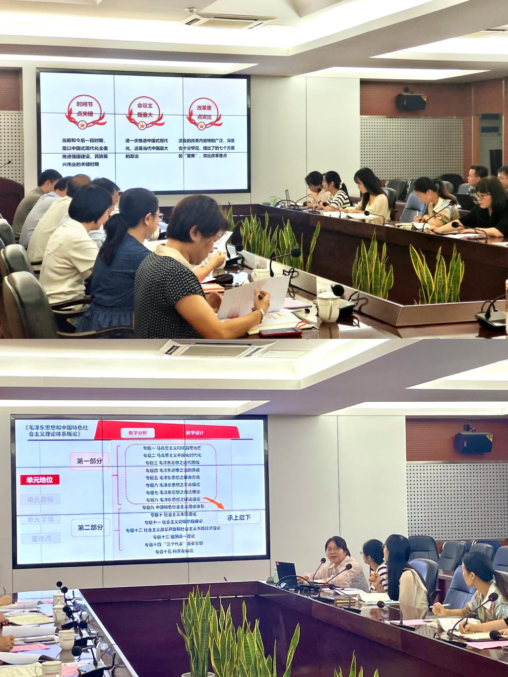 集備會(huì)上,張茵珠老師依托精彩的中國(guó)改革實(shí)踐、鮮活的教學(xué)案例素材,圍繞“形勢(shì)與政策”課程第一講“改革的實(shí)踐續(xù)篇 現(xiàn)代化的時(shí)代新篇”,以領(lǐng)會(huì)黨的二十屆三中全會(huì)精神實(shí)質(zhì)為目標(biāo)導(dǎo)向,通過回望意義非凡的三個(gè)三中全會(huì),結(jié)合黨的二十屆三中全會(huì)為現(xiàn)代職業(yè)教育發(fā)展指明的方向進(jìn)行集備展示。林美辰老師展示“毛澤東思想和中國(guó)特色社會(huì)主義理論體系概論”課程“專題八:毛澤東思想之建設(shè)理論”集備內(nèi)容,以“為何建設(shè)-如何建設(shè)-建設(shè)如何”為設(shè)計(jì)思路,從教材重構(gòu)、單元學(xué)情、教學(xué)目標(biāo)及重難點(diǎn)、教法學(xué)法、內(nèi)容講解等方面展開。與會(huì)教師圍繞如何創(chuàng)新教學(xué)手段、用準(zhǔn)用好用活教學(xué)案例、增強(qiáng)課堂互動(dòng)性等方面進(jìn)行了熱烈研討。