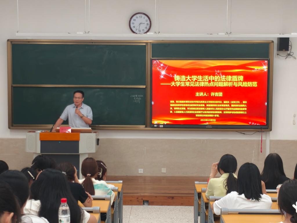 為進(jìn)一步筑牢校園安全防線,提升大學(xué)生的法律意識,引導(dǎo)大學(xué)生在日常學(xué)習(xí)生活中自覺尊法、學(xué)法、守法、用法,10月9日,我校特邀福建體育職業(yè)技術(shù)學(xué)院馬克思主義學(xué)院黨支部書記、副院長許吉團(tuán)在崇健樓205開展《鑄造大學(xué)生活中的法律盾牌——大學(xué)生常見法律熱點(diǎn)問題解析與風(fēng)險(xiǎn)防范》專題講座。講座由馬克思主義學(xué)院黨總支書記、院長熊美蘭主持,馬克思主義學(xué)院全體專兼課教師及學(xué)生代表參加。