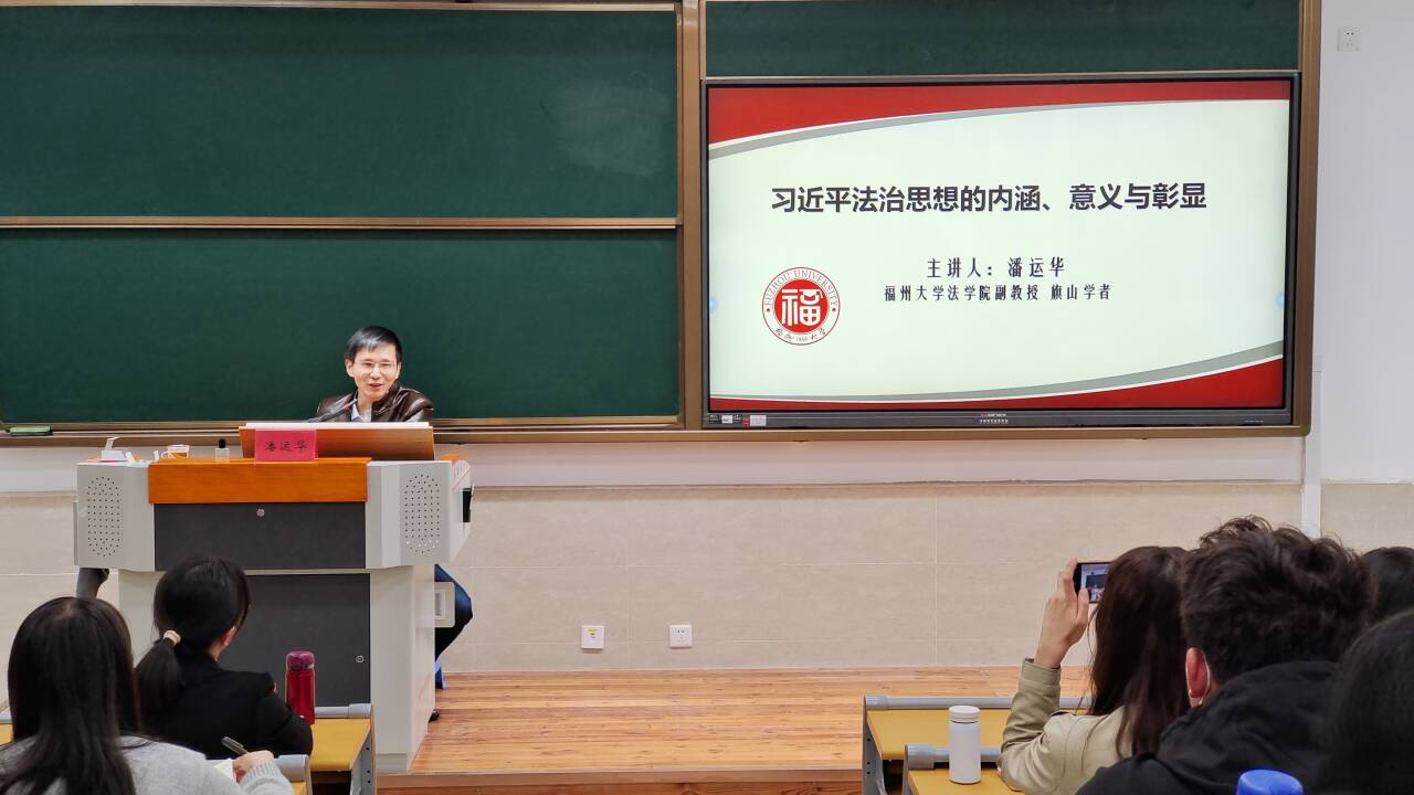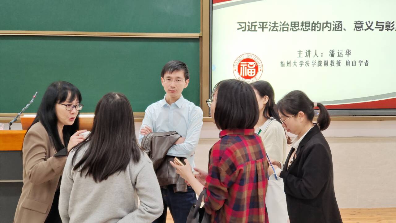 習近平法治思想是馬克思主義法治理論中國化的最新成果,是中國特色社會主義法治理論的重大創(chuàng)新發(fā)展,對于全面加快我國社會主義法治建設具有重大現(xiàn)實意義和深遠歷史意義。在第十個國家憲法日即將到來之際,為引導廣大師生大力弘揚憲法精神,建設社會主義法治文化,深刻認識我國社會主義法治的本質特征,深刻認同黨的領導是全面依法治國的根本保證,2023年11月23日,福建省民商法學研究會理事,福州大學“旗山學者”、法學院副教授潘運華受邀在崇健樓202開展專題講座、教學研討和法律咨詢“三組合”活動。我校思政課專兼職教師、醫(yī)學技術與工程學院部分學生參加講座,講座由馬克思主義學院院長熊美蘭、副院長來朋珍共同主持。