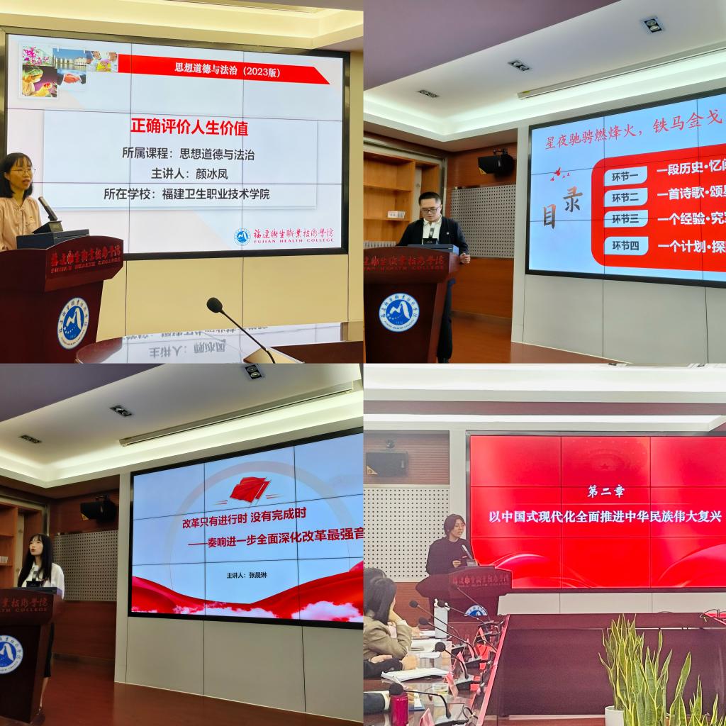 隨后,福州英華職業(yè)學院李佳瑞,我校劉宗永、張晨琳三位青年教師分別作題為《以中國式現(xiàn)代化全面推進中華民族偉大復興》《崢嶸閩西歲月 感悟軍事思想——從三打龍巖城看毛澤東軍事智慧》《改革只有進行時 沒有完成時——奏響進一步全面深化改革最強音》的片段教學展示。