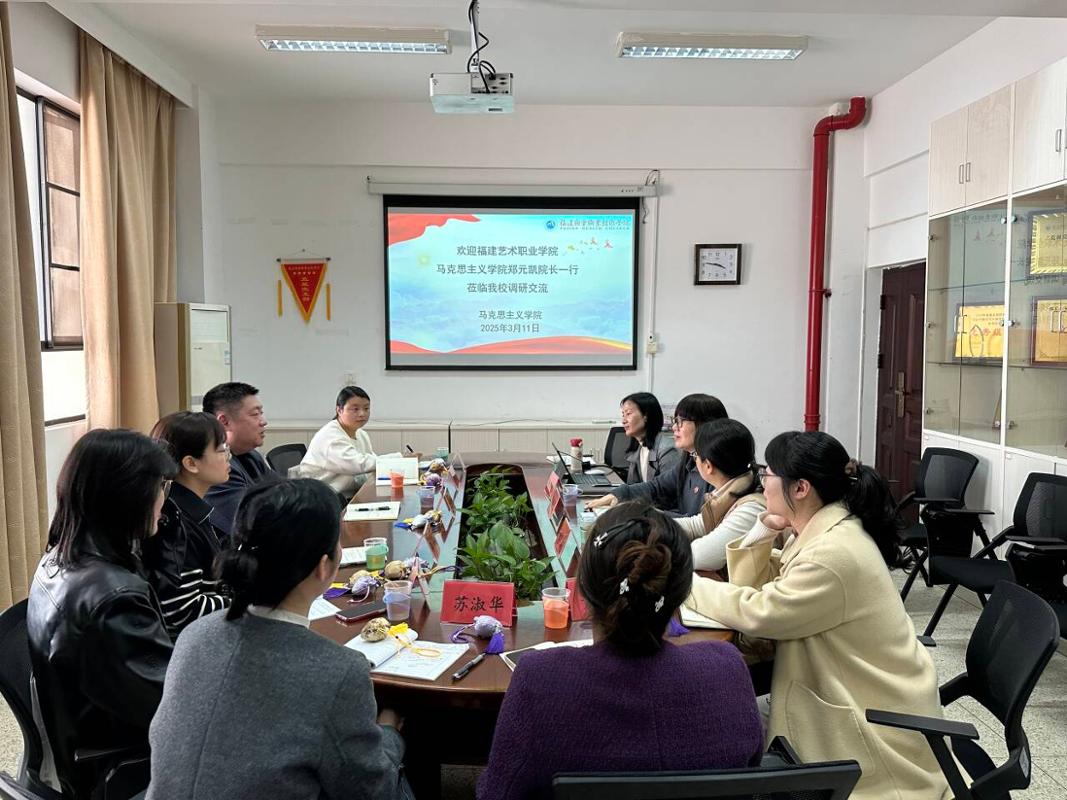 為深化新時代思政課改革創(chuàng)新,促進校際經(jīng)驗交流,3月11日,福建藝術職業(yè)學院馬克思主義學院院長鄭元凱一行7人來我校調研交流。我校馬克思主義學院領導班子成員、教研室主任、課程負責人參加座談交流。