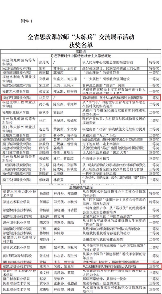 近日,《福建省教育廳關于公布全省思政課教師 “大練兵”交流展示活動評選結果的通知》文件公布,我校馬克思主義學院教師在活動中表現(xiàn)突出,榮獲二等獎1項、三等獎1項。
