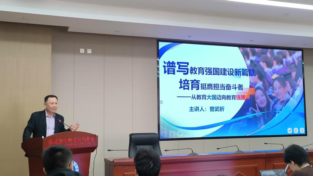 曾武祈從“為什么建:堅實基礎(chǔ) 戰(zhàn)略支撐”“建成什么:蓬勃發(fā)展 優(yōu)質(zhì)均衡”“怎樣建設(shè):深化改革 系統(tǒng)推進”“我校行動:錨定目標(biāo) 篤行實干”四個維度系統(tǒng)闡釋了教育強國的戰(zhàn)略意義與實踐路徑。他強調(diào),建設(shè)教育強國是實現(xiàn)中華民族偉大復(fù)興的基礎(chǔ)工程,高校作為人才培養(yǎng)主陣地,要堅持黨建引領(lǐng),將思政教育貫穿育人全過程。他寄語黨員教師,要主動對接國家戰(zhàn)略需求,為培養(yǎng)德智體美勞全面發(fā)展的社會主義建設(shè)者和接班人不懈奮斗。