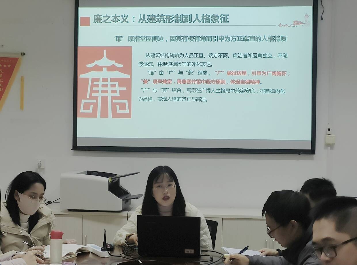 楊盈圍繞五個維度層層展開,系統(tǒng)闡釋了 “廉” 從建筑形制到人格象征的本義,明晰其作為思政教師立身之本的內(nèi)涵;結(jié)合思政教學(xué)、科研申報等工作排查廉潔風(fēng)險點,明確紀(jì)律紅線;通過教育系統(tǒng)典型違紀(jì)案例剖析根源、警示后果;分享廉潔從教先進典型事跡,引導(dǎo)全體教師黨員見賢思齊;呼吁大家將廉潔教育融入思政課教學(xué),把個人發(fā)展與學(xué)校事業(yè)結(jié)合,以廉潔之風(fēng)涵養(yǎng)優(yōu)良師風(fēng),堅守初心、擔(dān)當(dāng)作為,共同書寫學(xué)院內(nèi)涵式高質(zhì)量發(fā)展新篇章。