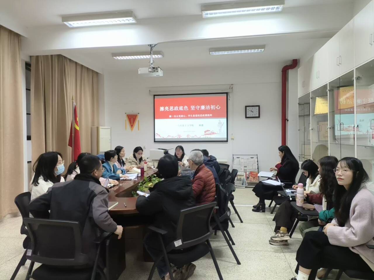 為深入貫徹全面從嚴(yán)治黨要求,筑牢教師黨員廉潔從教思想防線,切實將廉政教育融入思政課建設(shè)全過程,12月25日,馬克思主義學(xué)院黨總支紀(jì)檢委員楊盈以《擦亮思政底色 堅守廉潔初心》為題,為全院教師黨員講授專題黨課,引導(dǎo)全體教師黨員在教書育人中堅守廉潔底線,以清正之風(fēng)涵養(yǎng)優(yōu)良師德師風(fēng)。