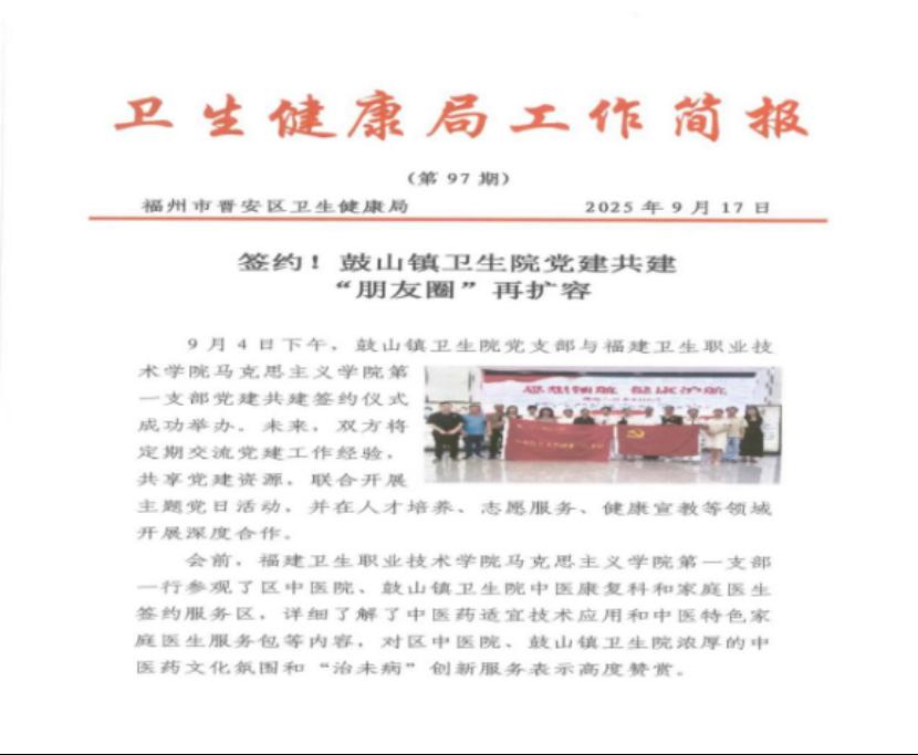 2025年9月4日,馬克思主義學(xué)院第一黨支部與晉安區(qū)鼓山鎮(zhèn)衛(wèi)生院黨支部成功“結(jié)對(duì)”,舉行黨建共建簽約儀式,點(diǎn)燃了校地協(xié)同、資源共享的“第一簇星火”。雙方將以共建為契機(jī),建立定期交流機(jī)制,共享黨建與業(yè)務(wù)資源,聯(lián)合開展主題黨日活動(dòng),并重點(diǎn)圍繞醫(yī)德醫(yī)風(fēng)教育、人才培養(yǎng)、志愿服務(wù)等領(lǐng)域深化合作。簽約前,支部黨員實(shí)地探訪了晉安區(qū)中醫(yī)院及鼓山鎮(zhèn)衛(wèi)生院的中醫(yī)康復(fù)科、家庭醫(yī)生簽約服務(wù)區(qū),深切感受基層醫(yī)療機(jī)構(gòu)的創(chuàng)新實(shí)踐與濃厚的中醫(yī)藥文化氛圍。此次共建,是“星火”品牌向外延伸、助力基層衛(wèi)生健康服務(wù)高質(zhì)量發(fā)展的關(guān)鍵一步。