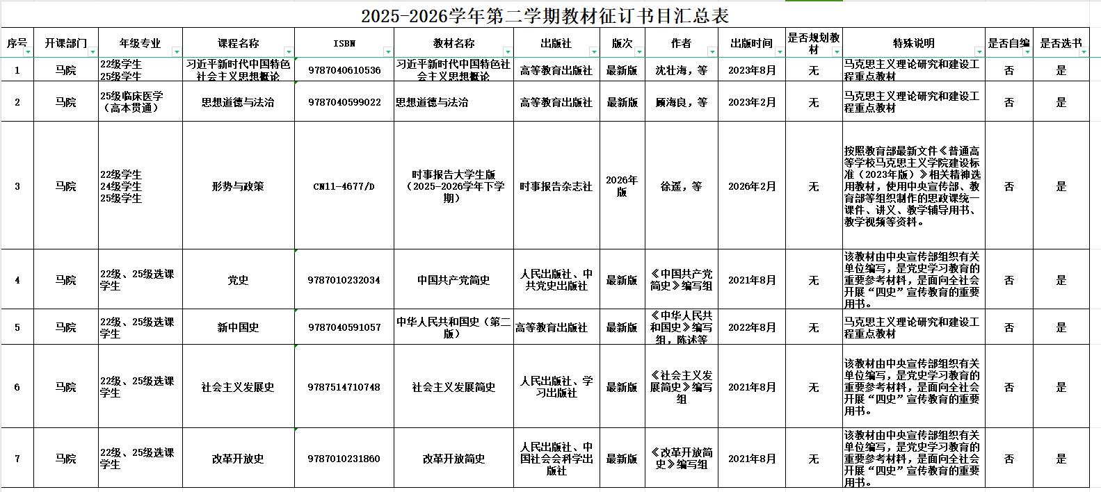 根據(jù)教務(wù)處下發(fā)的教材選用通知,經(jīng)各課程負(fù)責(zé)人、教研室主任初審,馬克思主義學(xué)院教材建設(shè)小組審核,擬定2025-2026學(xué)年第二學(xué)期教材選用情況如下: