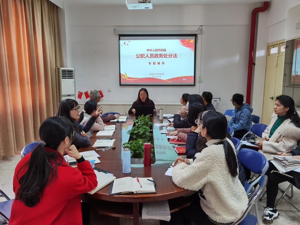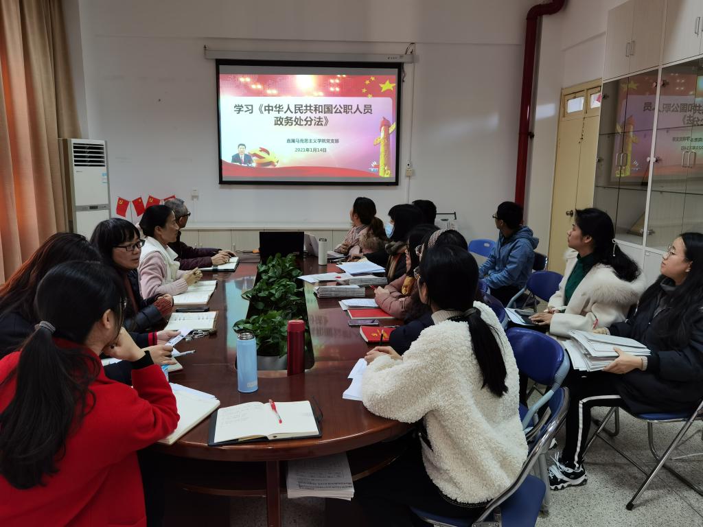 為切實(shí)領(lǐng)會(huì)、準(zhǔn)確把握《中華人民共和國(guó)公職人員政務(wù)處分法》(以下簡(jiǎn)稱《政務(wù)處分法》)的新精神、新要求,2021年1月14日下午,直屬馬克思主義學(xué)院黨支部組織全體黨員在行政樓107會(huì)議室專題學(xué)習(xí)《政務(wù)處分法》。學(xué)習(xí)會(huì)由黨支部書記熊美蘭同志主持,支部全體黨員同志參加了學(xué)習(xí)會(huì)。