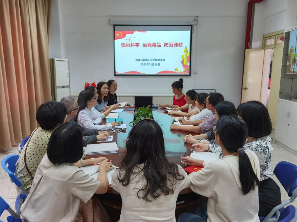 為進(jìn)一步提高廣大教師識(shí)邪辨邪防邪拒邪和科學(xué)防疫的意識(shí)和能力,11月19日下午,直屬馬克思主義學(xué)院黨支部在行政樓107會(huì)議室開展“崇尚科學(xué) 遠(yuǎn)離病毒 防范邪教”學(xué)習(xí)宣傳活動(dòng)。本次活動(dòng)由直屬馬克思主義學(xué)院黨支部書記熊美蘭主持,支部全體教師黨員參加了活動(dòng)。