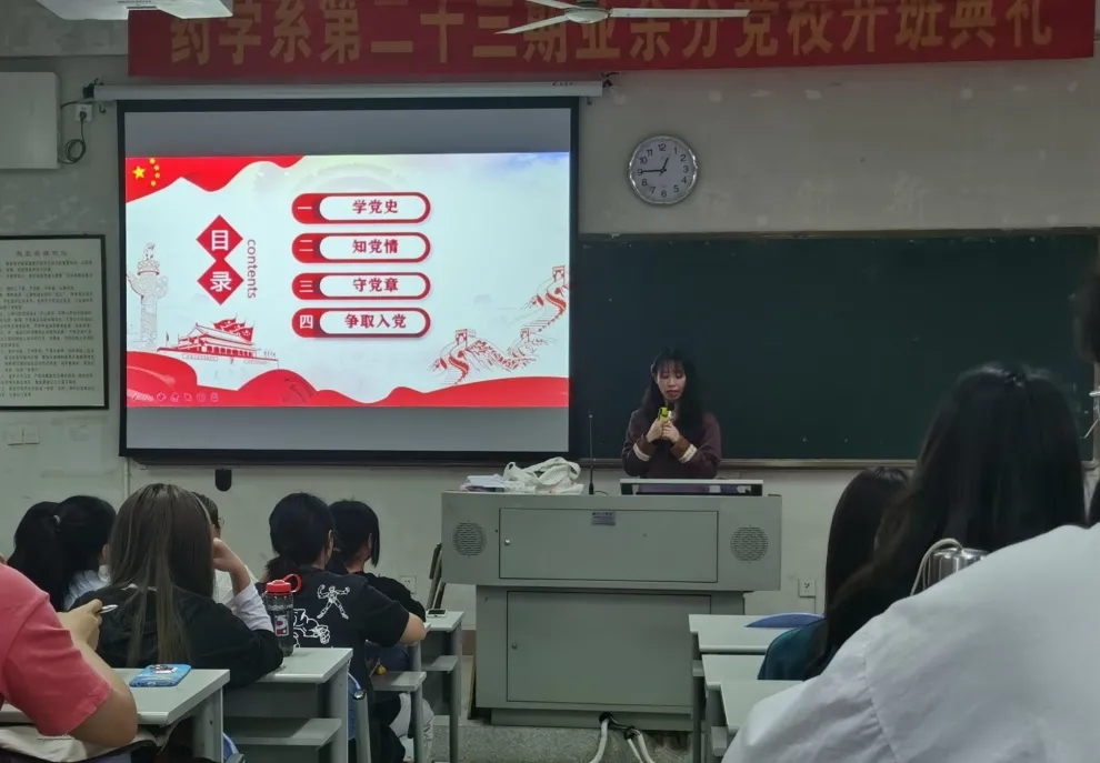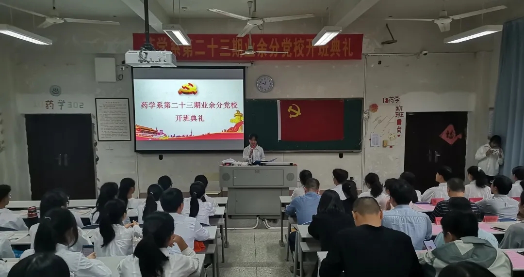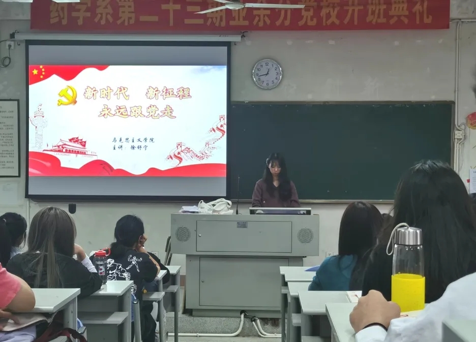 2020年10月19日,馬克思主義學(xué)院陳洪月、徐舒寧老師受邀參加藥學(xué)系第二十三期業(yè)余分黨校開班典禮。次日,馬克思主義學(xué)院徐舒寧老師在藥學(xué)系第一階梯教室為藥學(xué)系百余名業(yè)余分黨校學(xué)生進行入黨啟蒙教育。