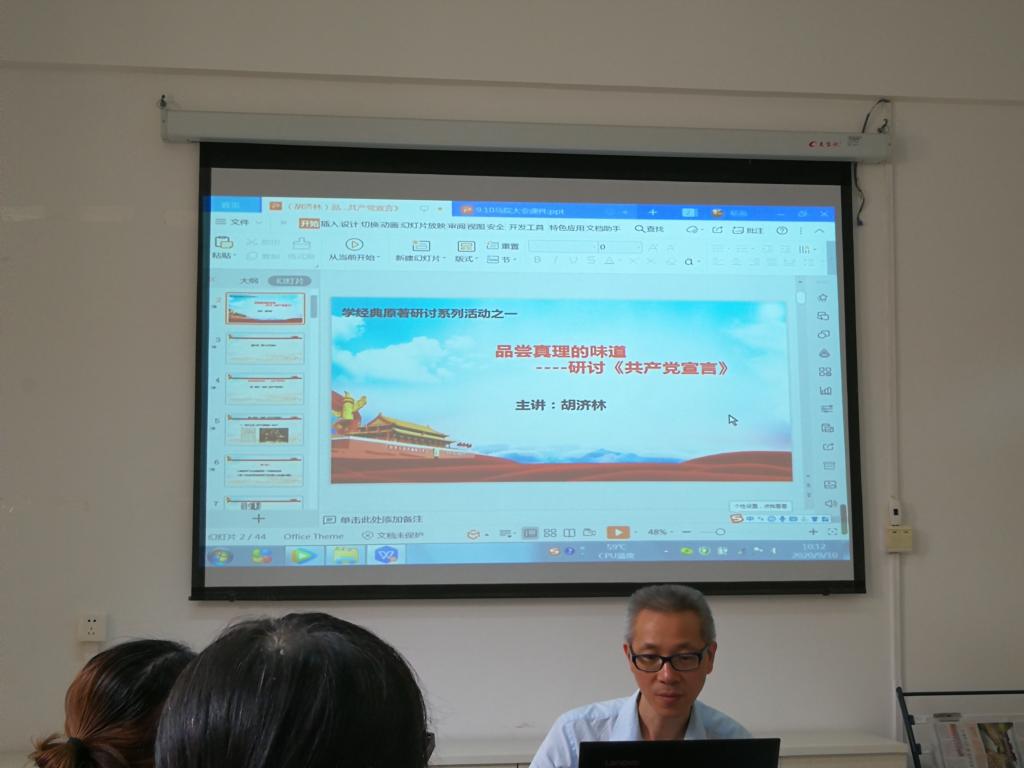 接著,大家一起學(xué)習(xí)了《黨政機(jī)關(guān)厲行節(jié)約反對(duì)浪費(fèi)條例》和《思政課是落實(shí)立德樹人根本任務(wù)的關(guān)鍵課程》,新任思政課教師羅蕓就學(xué)習(xí)《思政課是落實(shí)立德樹人根本任務(wù)的關(guān)鍵課程》交流了3點(diǎn)學(xué)習(xí)心得,一是不忘立德樹人初心;二是以“六個(gè)要”為標(biāo)準(zhǔn)找差距;三是按照“八個(gè)相統(tǒng)一”的要求積極參與思政課改革。學(xué)習(xí)完后,開展研學(xué)馬克思主義經(jīng)典原著活動(dòng),第一講由概論教研室主任胡濟(jì)林老師主講《品嘗真理的味道——研討<共產(chǎn)黨宣言>》。