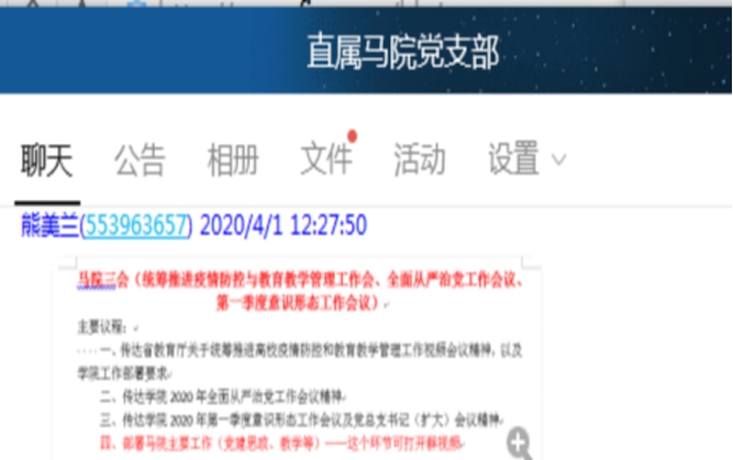 “疫情就是命令,防控就是責任”。2020年4月1日,直屬馬克思主義學院黨支部通過網(wǎng)絡視頻召開統(tǒng)籌推進高校疫情防控和教育教學管理工作會議。會議由支部書記熊美蘭主持,全體教師黨員參加了會議。