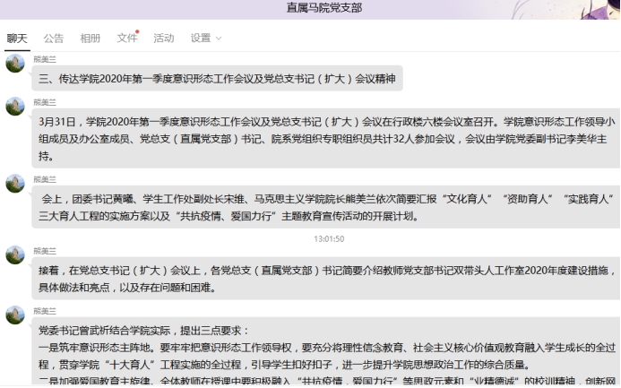 2020年4月1日,馬院黨支部全體黨員在線上召開2020年第一季度意識(shí)形態(tài)工作會(huì)議,會(huì)議由馬院支部書記熊美蘭主持,全體支部黨員參加了會(huì)議。