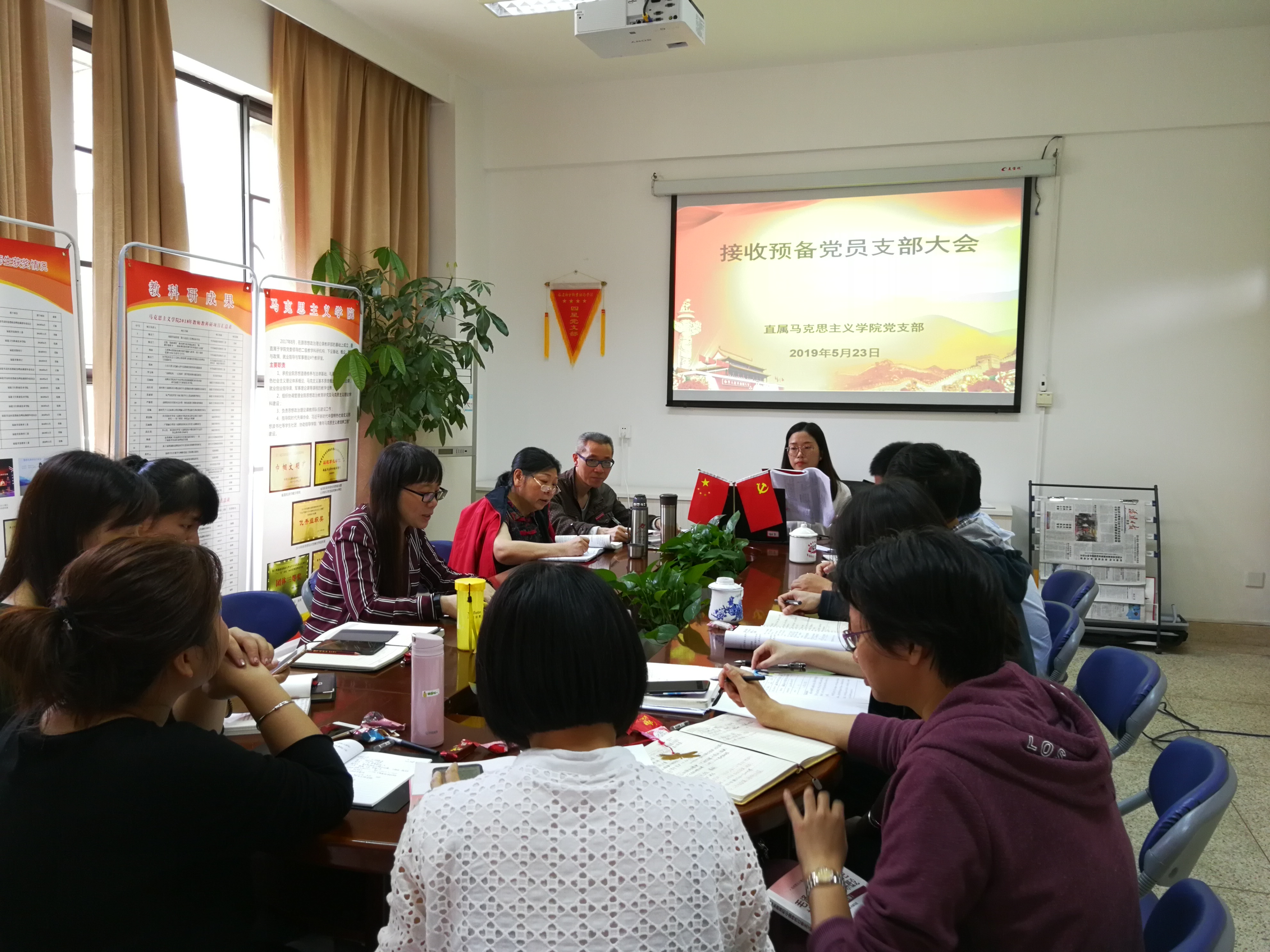 2019年5月23日上午,直屬馬克思主義學(xué)院黨支部在馬克思主義學(xué)院會(huì)議室召開(kāi)接收預(yù)備黨員大會(huì)。會(huì)議由支部書(shū)記熊美蘭同志主持,支部12名正式黨員同志全部與會(huì)。