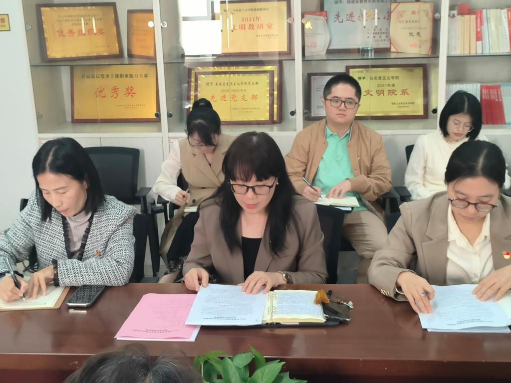 院黨總支書記熊美蘭從“壓緊壓實責任鏈條,著力扛起政治擔當”“深學細悟理論精髓,著力筑牢思想支柱”“黨建領(lǐng)航融匯力量,著力深耕育人主業(yè)”三個方面對馬院全面從嚴治黨主體責任落實情況進行了詳細匯報,同時對黨建業(yè)務融合、關(guān)鍵課程建設、黨員隊伍建設等工作中存在的問題與不足進行了深入的剖析,并提出了下一步工作思路。