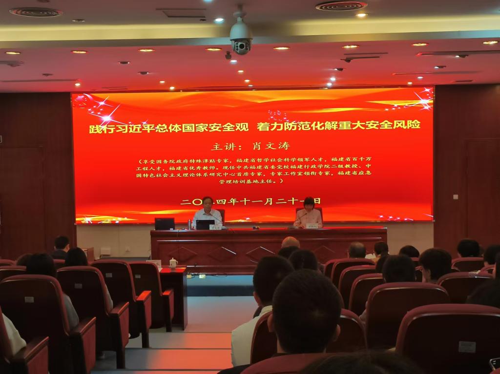 為深入學(xué)習(xí)貫徹黨的二十大、黨的二十屆三中全會精神,深刻理解和把握總體國家安全觀,2024年11月21日,馬克思主義學(xué)院第一黨支部在篤行樓四樓報告廳開展主題黨日活動,共同學(xué)習(xí)由國務(wù)院政府特殊津貼專家、福建省應(yīng)急管理培訓(xùn)基地主任、中共福建省委黨校福建行政學(xué)院肖文濤教授帶來的《踐行總體國家安全觀 著力防范化解重大安全風(fēng)險》專題講座。