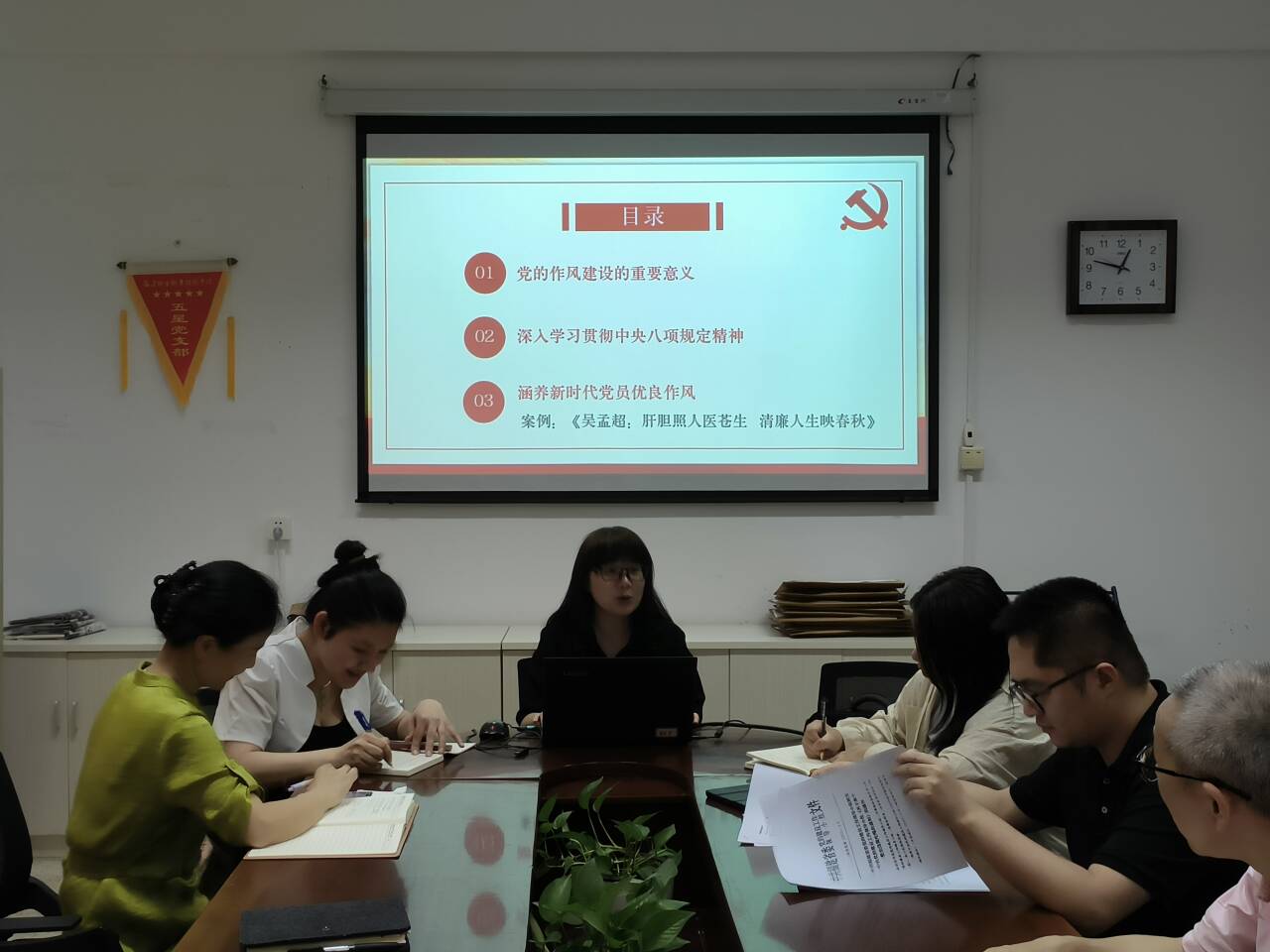 熊美蘭從“黨的作風(fēng)建設(shè)的重要意義”“深入貫徹中央八項規(guī)定精神”“涵養(yǎng)新時代黨員優(yōu)良作風(fēng)”三個方面進行深入解讀,對進一步規(guī)范外出學(xué)習(xí)、培訓(xùn)、考察等活動要求作了梳理,并對“吳孟超:肝膽照人醫(yī)蒼生 清廉人生映春秋”典型案例予以分享,展現(xiàn)吳孟超奉獻、清廉的一生的先進事跡,體現(xiàn)共產(chǎn)黨員的純真黨性和人格魅力。她強調(diào),中央八項規(guī)定是長期有效的鐵規(guī)矩、硬杠杠,必須持之以恒、久久為功。思想上,筑牢信仰之基、補足精神之鈣、把穩(wěn)思想之舵,以堅定的理想信念引領(lǐng)優(yōu)良作風(fēng)的養(yǎng)成;紀律上,做到心有所畏、言有所戒、行有所止,以嚴明的紀律保障作風(fēng)建設(shè)取得實效;工作中,勇于擔(dān)當(dāng)作為,積極干事創(chuàng)業(yè),以良好的精神狀態(tài)和扎實的工作作風(fēng),推動各項工作任務(wù)的落實落細,將黨的作風(fēng)建設(shè)經(jīng)驗融入思政課程,續(xù)寫思政教育新篇章。