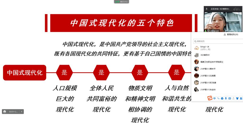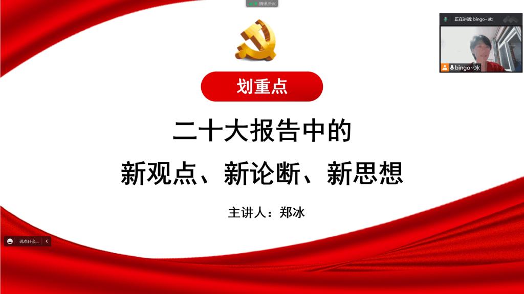 2022年11月16日,習(xí)近平新時(shí)代中國(guó)特色社會(huì)主義思想讀書社夢(mèng)之隊(duì)的隊(duì)員們?cè)隍v訊會(huì)議平臺(tái)上聆聽了鄭冰老師進(jìn)行的題為“黨的二十大報(bào)告中的新觀點(diǎn)、新論斷、新思想”的宣講。此次活動(dòng)是馬克思主義學(xué)院學(xué)習(xí)貫徹黨的二十大精神系列宣講活動(dòng)之一。