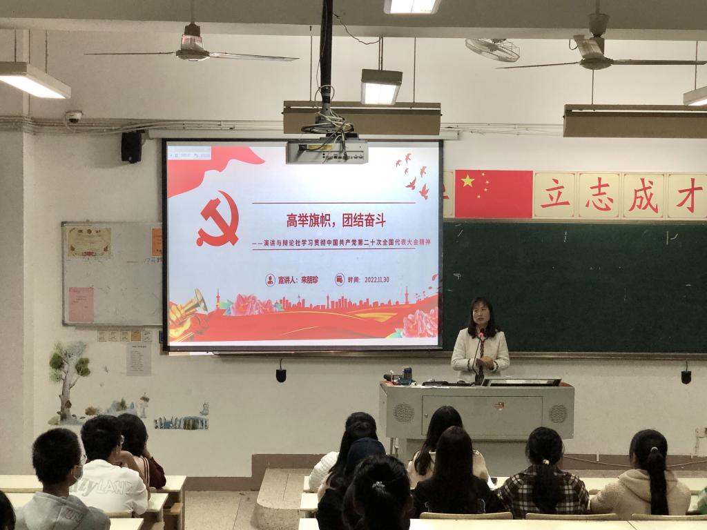 傳精神火種,聚奮進(jìn)力量。為深入學(xué)習(xí)宣傳貫徹黨的二十大精神,2022年11月30日,演講與辯論社指導(dǎo)老師來朋珍在教學(xué)樓315教室對全體社團(tuán)成員開展了“高舉旗幟奮斗團(tuán)結(jié)”為主題的學(xué)習(xí)黨的二十大精神宣講。