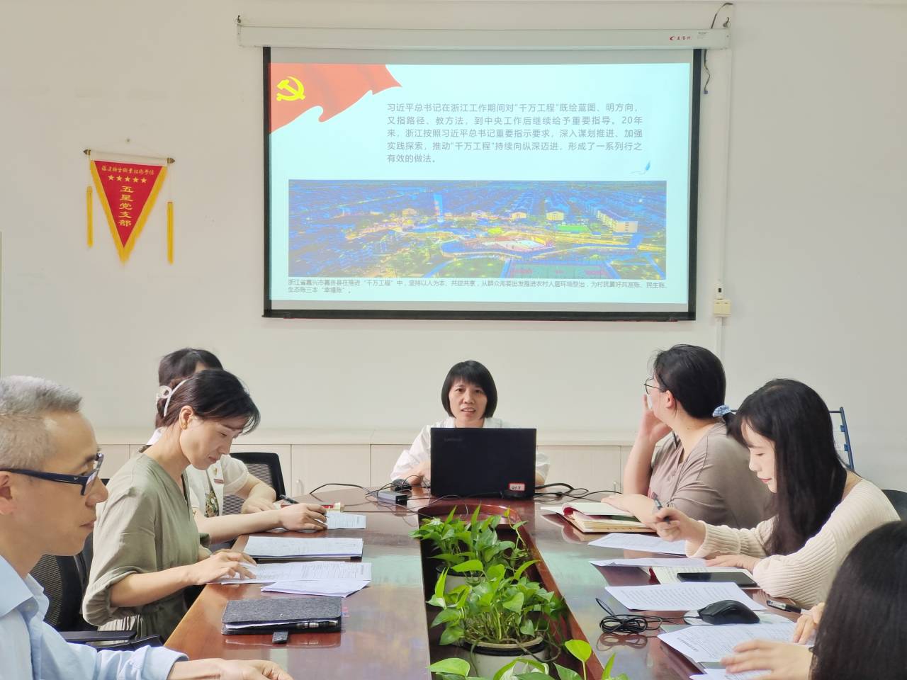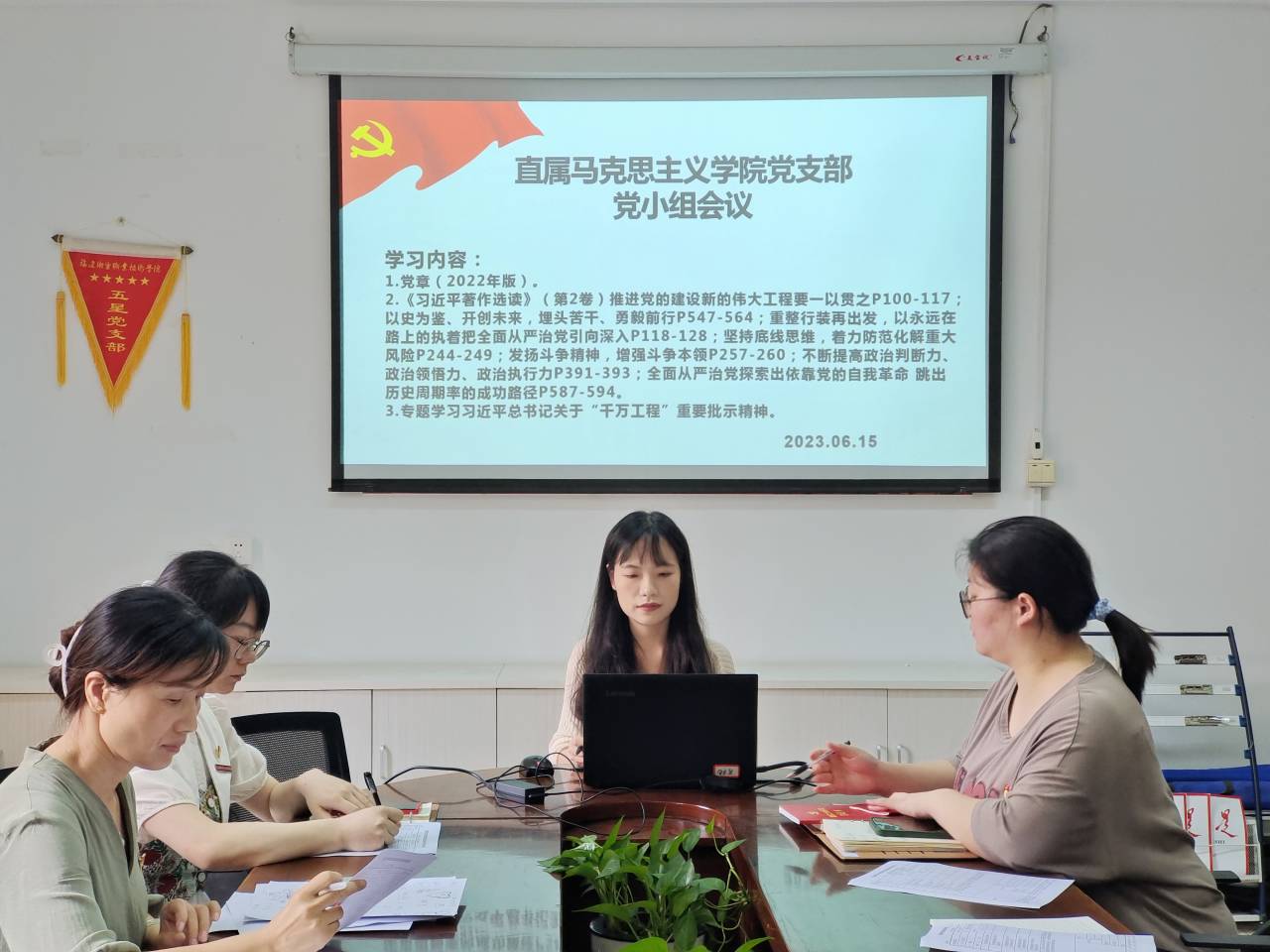 2023年6月15日,直屬馬克思主義學院黨支部以黨小組形式,在行政樓107開展理論學習,會議由黨支部書記熊美蘭主持。