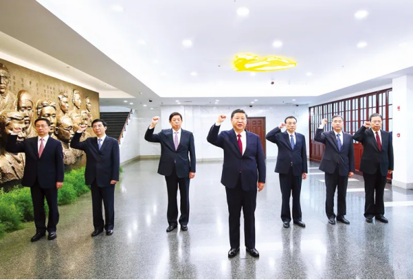 2017年10月31日,習(xí)近平帶領(lǐng)中共中央政治局常委李克強、栗戰(zhàn)書、汪洋、王滬寧、趙樂際、韓正,在上海中共一大會址紀念館重溫入黨誓詞。
