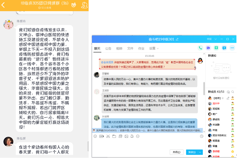 衛(wèi)院學(xué)子通過觀看疫情防控思政大課,結(jié)合自身實(shí)際,紛紛發(fā)表強(qiáng)烈感想?!白屛一匚稛o窮的是馮老師講的:我們最大的青春蛻變是走出孤芳自賞的‘小我’,走向擔(dān)當(dāng)民族復(fù)興責(zé)任的‘大我’,樹立責(zé)任意識(shí)與憂患意識(shí)。作為一名醫(yī)學(xué)生,我應(yīng)該刻苦學(xué)習(xí),積蓄報(bào)國的本領(lǐng)和才干,將來做一名大愛無疆、德技雙馨的好醫(yī)生!”19級(jí)臨床醫(yī)學(xué)專業(yè)的鐘露同學(xué)感觸頗深?!包h堅(jiān)持以人民為中心,領(lǐng)導(dǎo)和依靠億萬人民群眾,堅(jiān)定信心、同舟共濟(jì)、科學(xué)防治、精準(zhǔn)施策,展示了中國理念、中國速度、中國規(guī)模、中國效率,充分彰顯了中國特色社會(huì)主義的制度優(yōu)勢(shì),也更加堅(jiān)定了我入黨決心,以后我要處處嚴(yán)格要求自己,爭取早日入黨,那時(shí)候我也可以說‘我是黨員,我先上’!”19藥品生產(chǎn)技術(shù)專業(yè)董馨同學(xué)如是說?!澳嫘旭Y援,白袍加身,十七年前被保護(hù)的少年們,扛起了“白衣天使”的神圣使命。在新長征路上的新時(shí)代青年,要擔(dān)起實(shí)現(xiàn)民族偉大復(fù)興的責(zé)任,展現(xiàn)青年擔(dān)當(dāng)!”18級(jí)護(hù)理專業(yè)廖琳欣同學(xué)表達(dá)自己的想法?!榜R上就要畢業(yè)踏入工作崗位了,未來的我一定不忘“業(yè)精德誠”的校訓(xùn)和老師諄諄教誨,愛崗敬業(yè),用我所學(xué)治病救人、利國利民,并且讓患者感受到我發(fā)自內(nèi)心的真善美,有時(shí)去治愈、常常去幫助、總是去安慰?!?7級(jí)學(xué)生動(dòng)情地說。