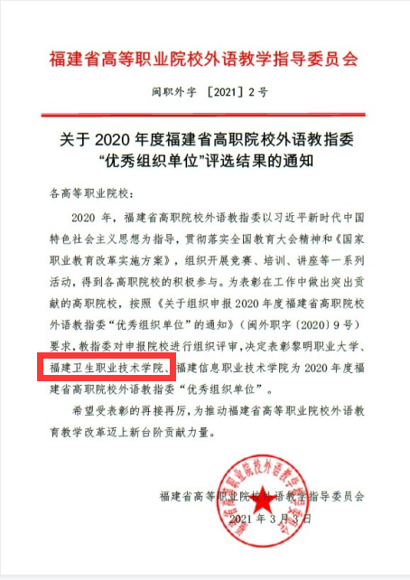 喜報?我校榮獲 2020年度福建省高職院校 外語教指委“優(yōu)秀組織單位”