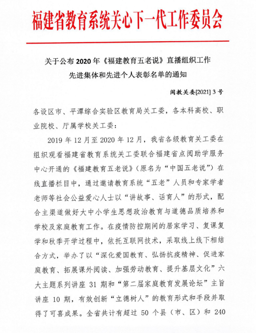 2021年1月,福建省教育系統(tǒng)關(guān)工委公布了2020年《福建教育五老說》(原名為“中國五老說”)直播組織工作先進(jìn)集體和先進(jìn)個人表彰名單,我校關(guān)工委榮獲2020年《福建教育五老說》直播組織工作先進(jìn)集體榮譽(yù)稱號。