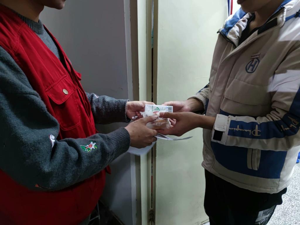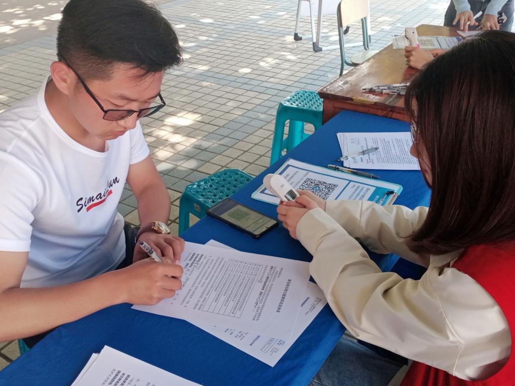 志愿者配合現(xiàn)場專業(yè)人士對獻血者進行體檢