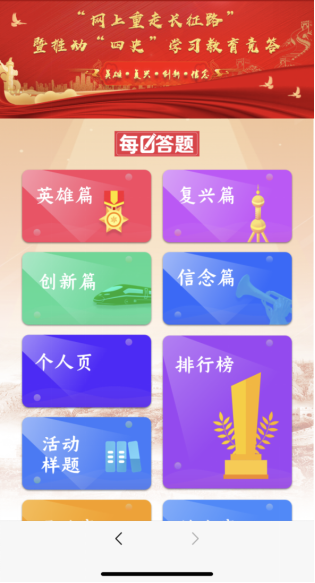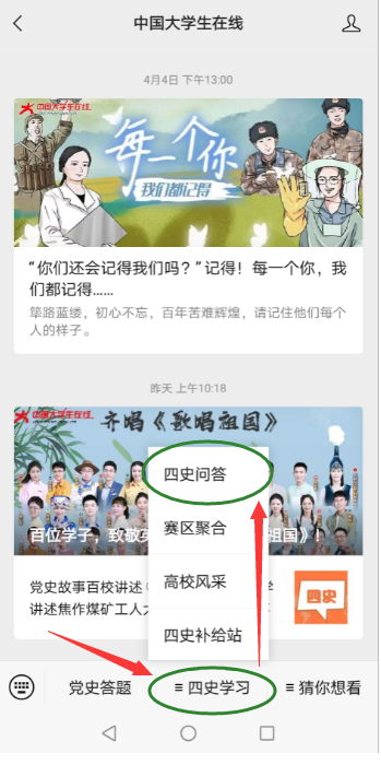 步驟2:從公眾號(hào)菜單點(diǎn)擊“四史學(xué)習(xí)”——“四史問(wèn)答”參與答題學(xué)習(xí)。
