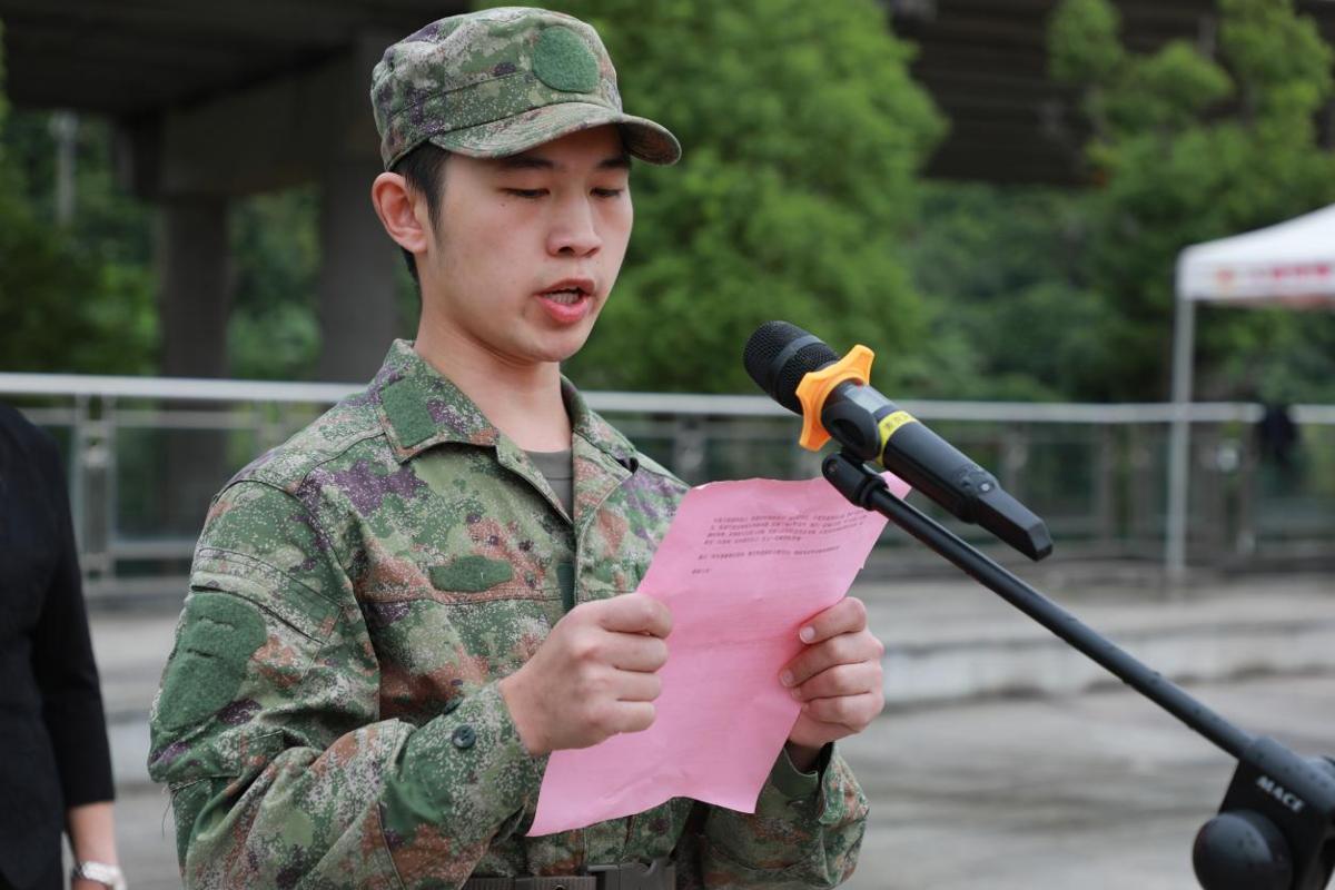 參訓(xùn)教官代表要求教官團(tuán)隊(duì)嚴(yán)格按照軍訓(xùn)大綱執(zhí)行任務(wù),希望同學(xué)們能以軍人的身份嚴(yán)格要求自己,把訓(xùn)練中的收獲轉(zhuǎn)化為前進(jìn)的動力。