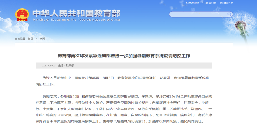 近期,國內(nèi)新冠肺炎疫情病例數(shù)有所增加,教育部再次印發(fā)緊急通知,部署進一步加強暑期教育系統(tǒng)疫情防控工作。疫情防控無小事,防微杜漸是大事,請全體學生提高疫情防控意識,做好各類安全防護。